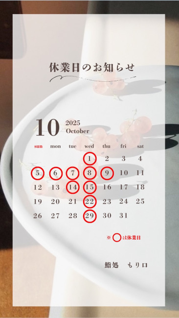 10/5(日)~10/9(木)は臨時休業致しますのでご注意ください。